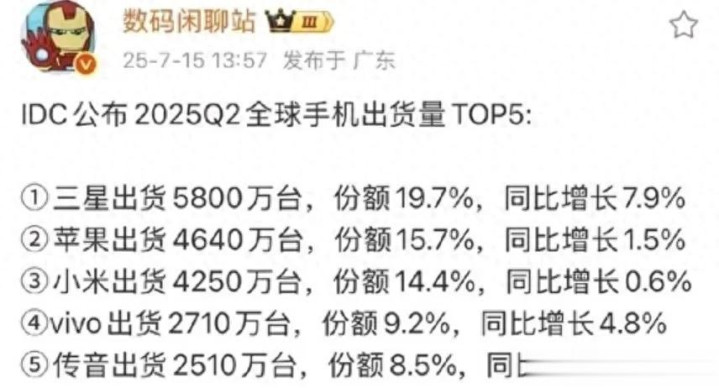 看一组数据:2024 年第二季度,全球智能手机出货量数据一公布。三星出货量达到了 5380 万部,市场占有率将近 19%;2025年第二季度,三星出货量达到了 5800 万部,市场占有率将近 19.7%;稳稳地坐在全球智能手机市场的头把交椅上 。这么高的出货量,那它的销售范围肯定小不了,说不定真的是全球都有它的 “粉丝” 呢!